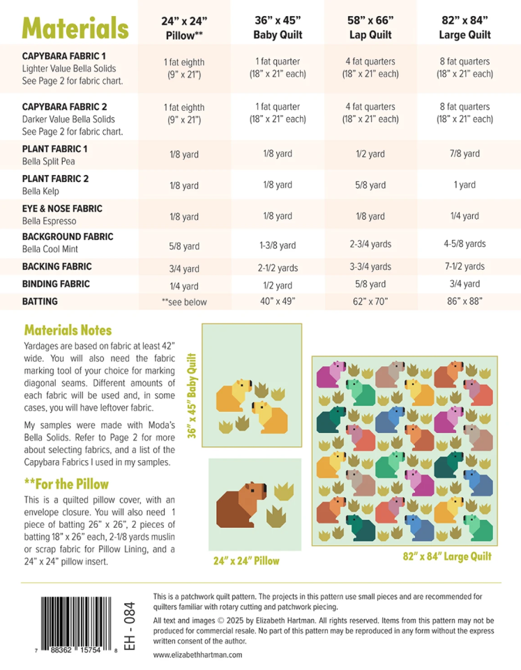 Join the Capybara Club! These patchwork cuties are made using fat quarters and conventional piecing techniques. No templates or paper piecing! The capybara blocks in all quilt sizes are made with fat quarters. The quilt also includes plant blocks, which are pieced with yardage of two different plant fabrics. Please refer to the pattern back for a complete materials list and yardages. Solid and/or small, non-directional fabrics are recommended. This is a patchwork quilt pattern. (No templates or paper piecing are used.) The projects in this pattern include some small pieces and are recommended for quilters familiar with rotary cutting and patchwork piecing.